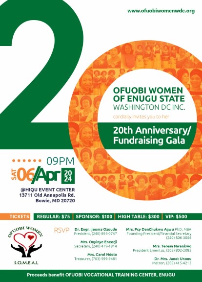 It s my honor and pleasure to specially invite you to the *OFUOBI WOMEN OF ENUGU STATE* *20TH ANNIVERSARY FUNDRAISING GALA EVENT*